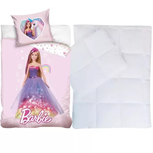Nagyon aranyos motívumokkal ellátott 2 részes Barbies gyermek ágyneműhuzat garnitúra, a hozzá méretben azonos Lalian paplan-párna szettel együtt.