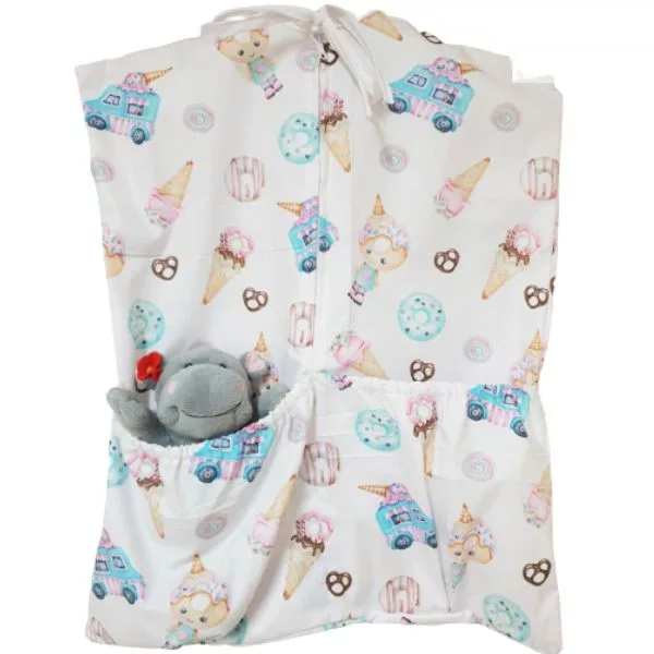 Szeretnéd, ha gyermeked dolgai mindig szép rendben lennének az óvodában? Egyszerű megoldást jelent erre a problémára ez az aranyos mintákkal ellátott ovis zsák. Könnyedén vállfára akasztható, praktikus, hogy a gyermek váltóruháját tisztán tudjuk tárolni. Eleje cipzáros, emellett található rajta két kisebb gumírozott zseb, a gyermek apróbb dolgainak. 100% pamutból készült, 40°C-on mosható, vasalható. Mérete: 45x60 cm.