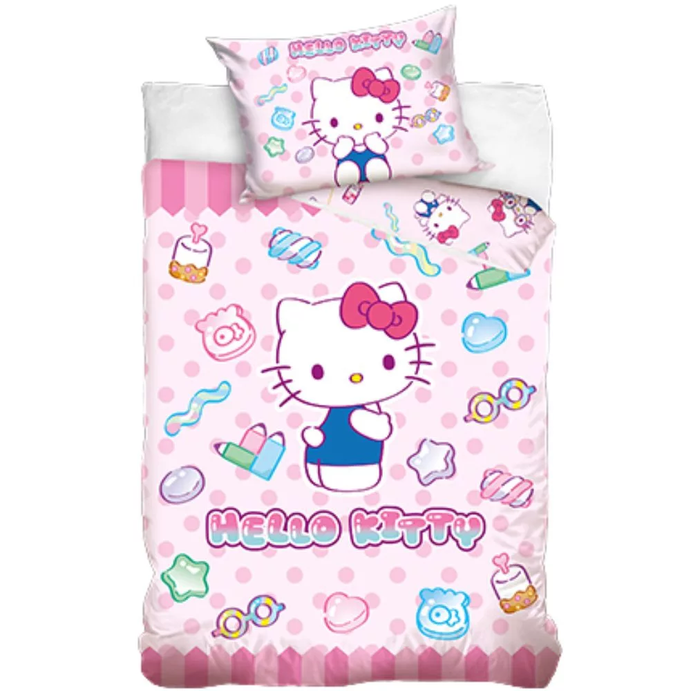 A Hello Kitty ovis ágynemű (Cuki világ) tökéletes választás minden kisgyermek számára, aki rajong a kedves és vidám figurákért. A rózsaszín, játékos mintákkal díszített ágyneműhuzat közepén a bájos Hello Kitty figura látható, amely körül cukorkák, csillagok és színes kis motívumok teszik még vidámabbá az összképet.