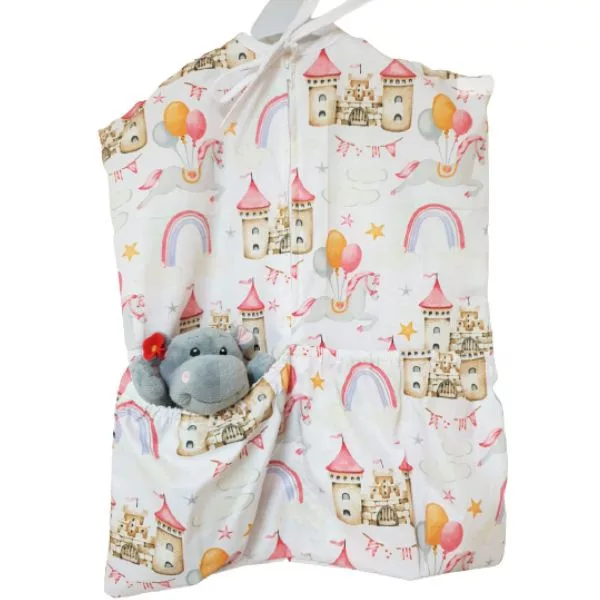 Szeretnéd, ha gyermeked dolgai mindig szép rendben lennének az óvodában? Egyszerű megoldást jelent erre a problémára ez az aranyos mintákkal ellátott ovis zsák. Könnyedén vállfára akasztható, praktikus, hogy a gyermek váltóruháját tisztán tudjuk tárolni. Eleje cipzáros, emellett található rajta két kisebb gumírozott zseb, a gyermek apróbb dolgainak. 100% pamutból készült, 40°C-on mosható, vasalható. Mérete: 45x60 cm.