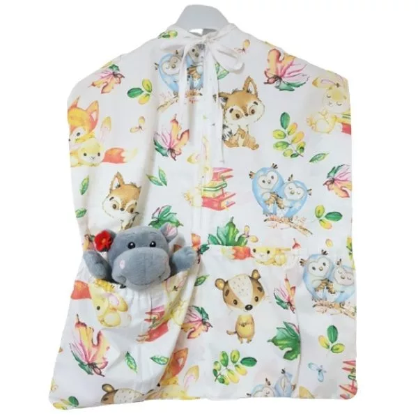 Szeretnéd, ha gyermeked dolgai mindig szép rendben lennének az óvodában? Egyszerű megoldást jelent erre a problémára ez az aranyos mintákkal ellátott ovis zsák. Könnyedén vállfára akasztható, praktikus, hogy a gyermek váltóruháját tisztán tudjuk tárolni. Eleje cipzáros, emellett található rajta két kisebb gumírozott zseb, a gyermek apróbb dolgainak. 100% pamutból készült, 40°C-on mosható, vasalható. Mérete: 45x60 cm.