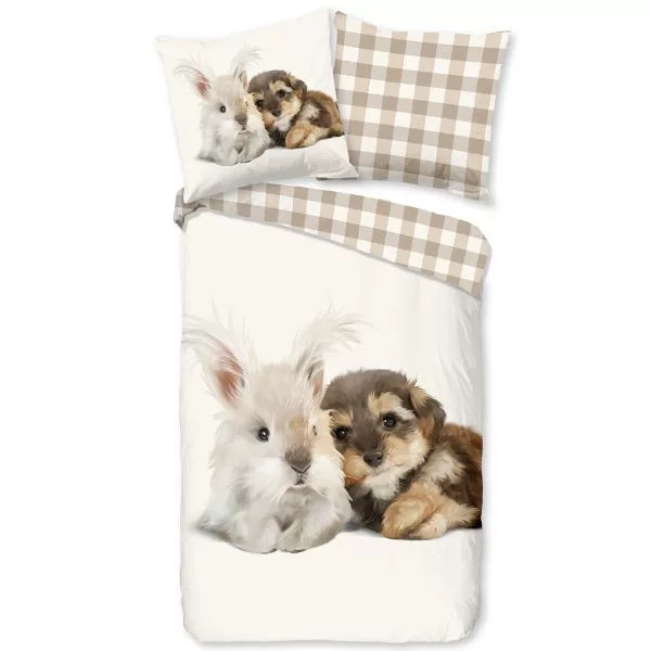 Gyönyörű 2 részes Kutyusos, nyuszis ágyneműhuzat garnitúra, mely kiváló 100% pamut anyagának köszönhetően tökéletes pihenést biztosít, kicsiknek és nagyoknak egyaránt.