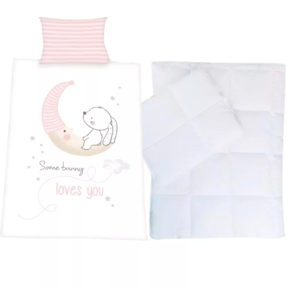 Nagyon aranyos motívumokkal ellátott 2 részes nyuszis gyermek ágyneműhuzat garnitúra, a hozzá méretben azonos Lalian paplan-párna szettel együtt.