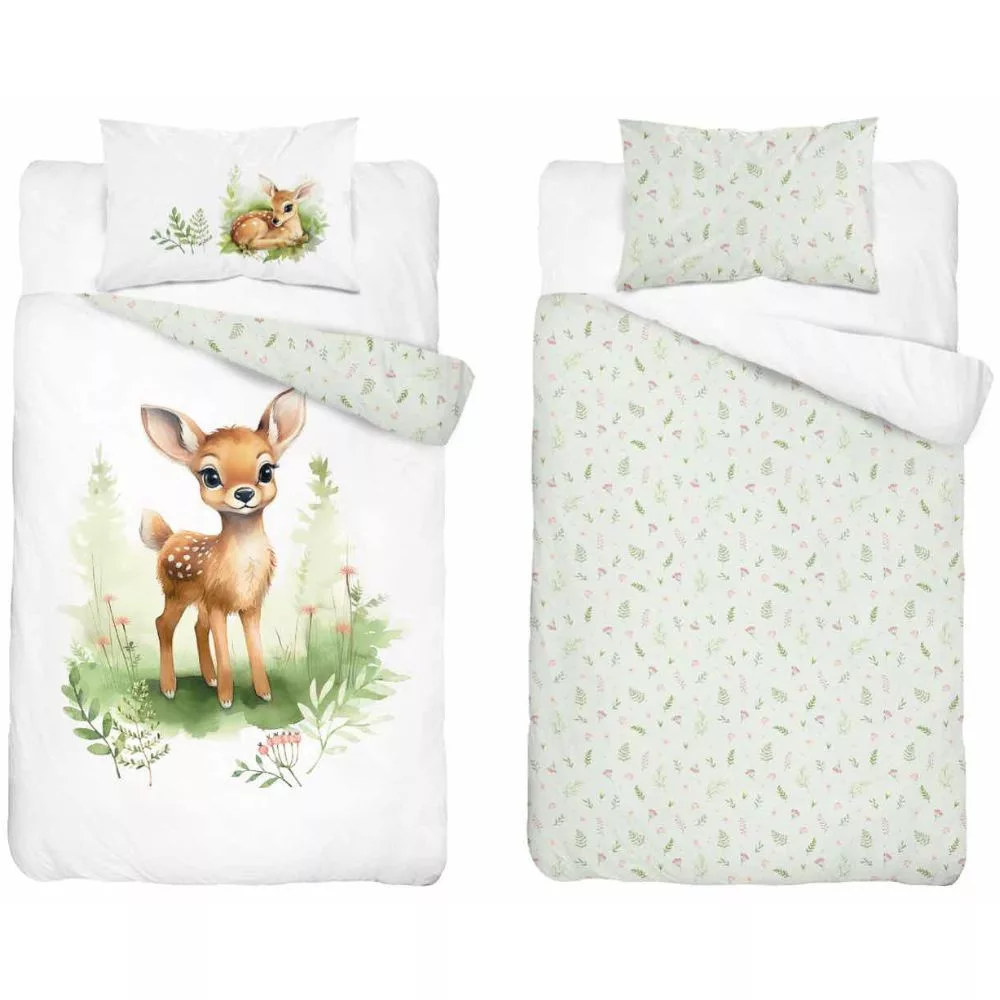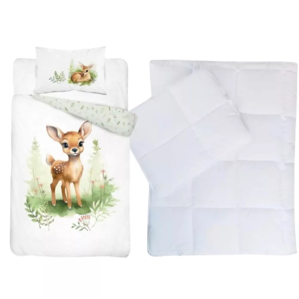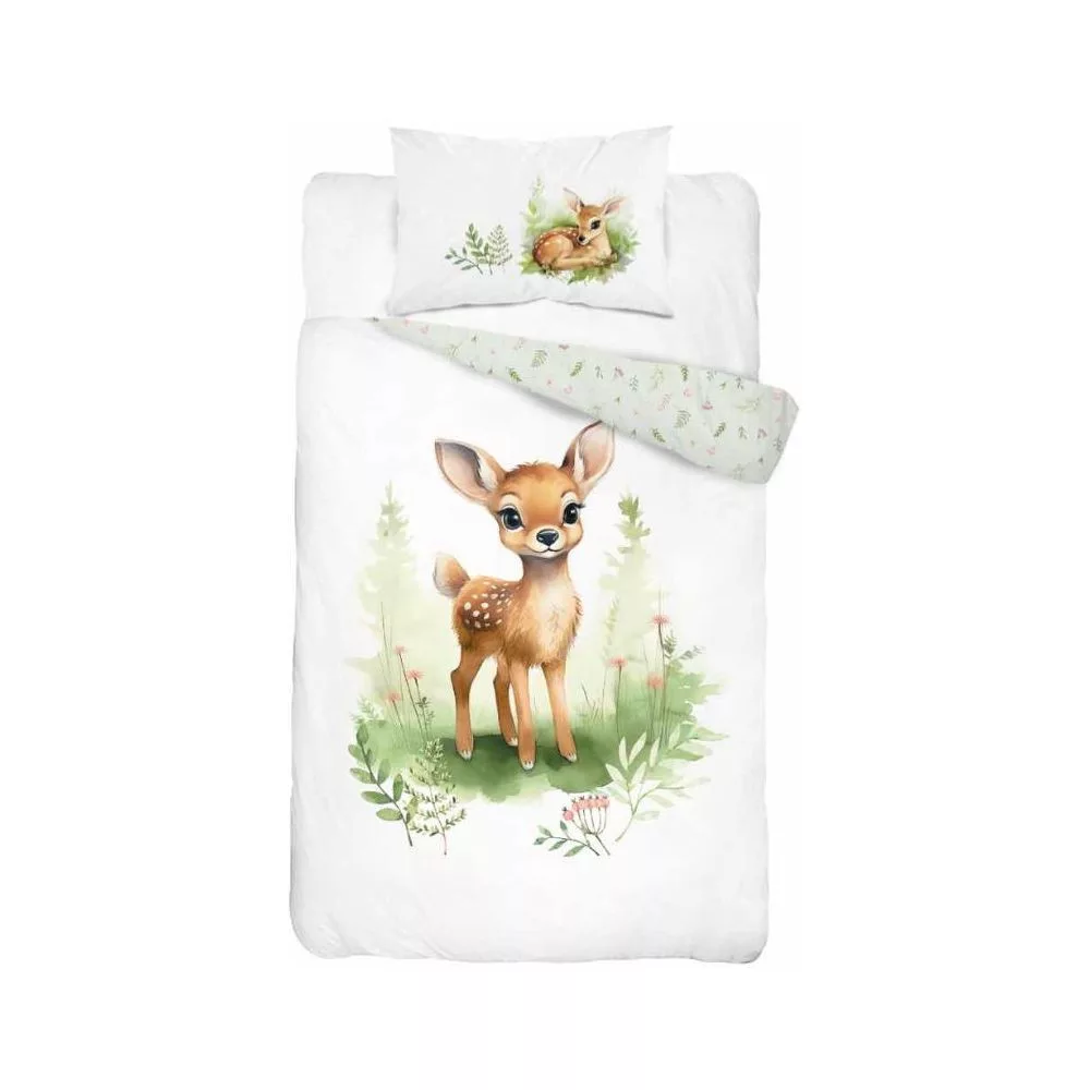 Nagyon aranyos motívumokkal ellátott 2 részes őzikés gyermek ágyneműhuzat garnitúra, a hozzá méretben azonos Lalian paplan-párna szettel együtt.