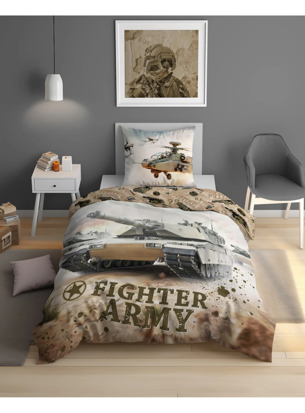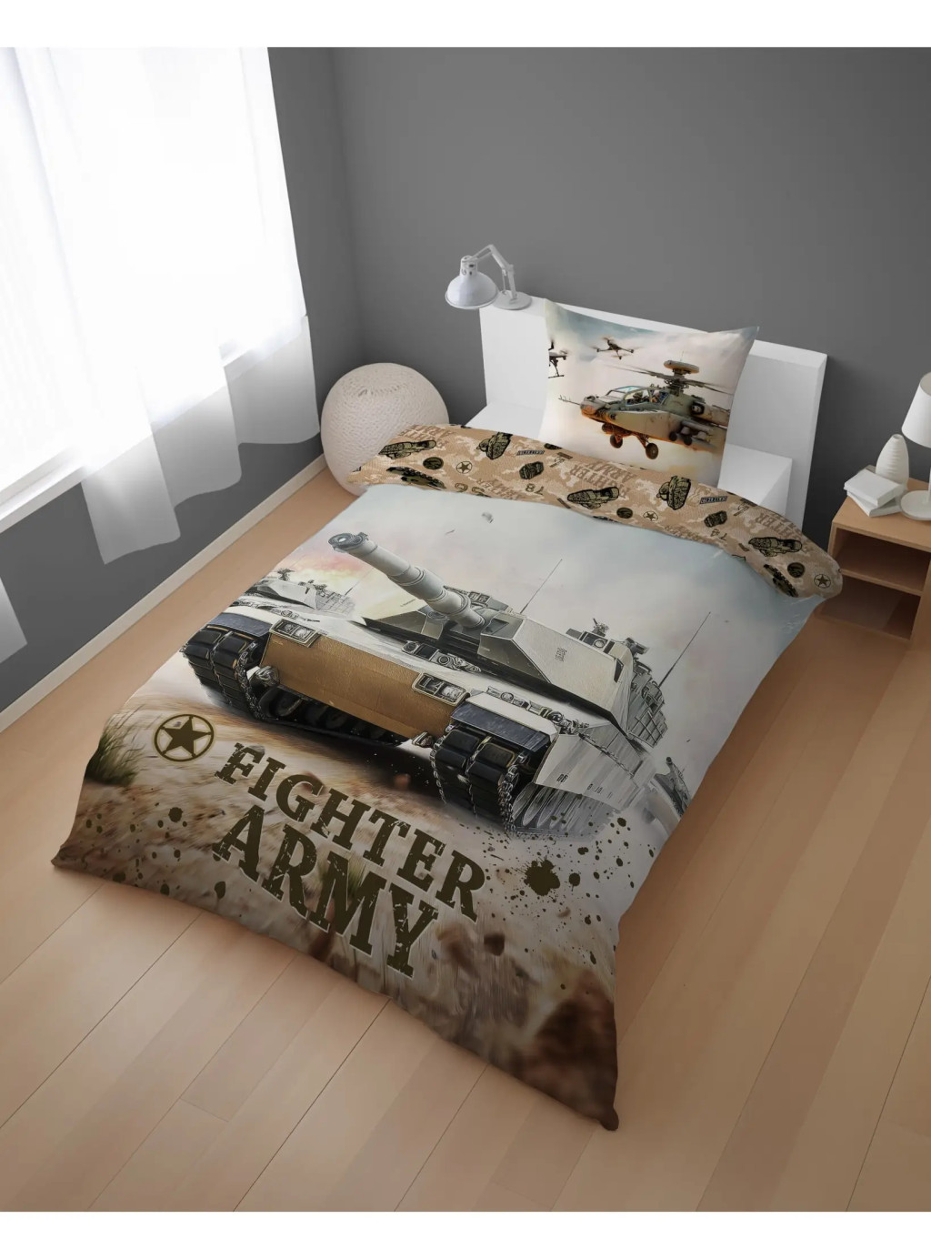 A Fighter Army katonai ágynemű garnitúra tökéletes választás minden olyan gyermek és tini számára, aki rajong a harcjárművek, tankok, helikopterek és a katonai világ izgalmai iránt. A részletgazdag grafikák életre keltik az akciófilmek világát: az ágynemű elején hatalmas, erőt sugárzó harckocsi látható, míg a párnahuzaton támogató helikopterek repülnek – így a szoba igazi csatatéri hangulatot kap.