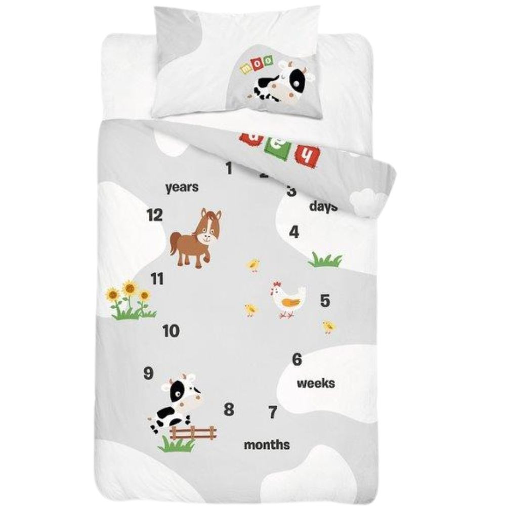 Nagyon aranyos motívumokkal ellátott 2 részes gyermek ágyneműhuzat garnitúra, a hozzá méretben azonos Lalian paplan-párna szettel együtt.