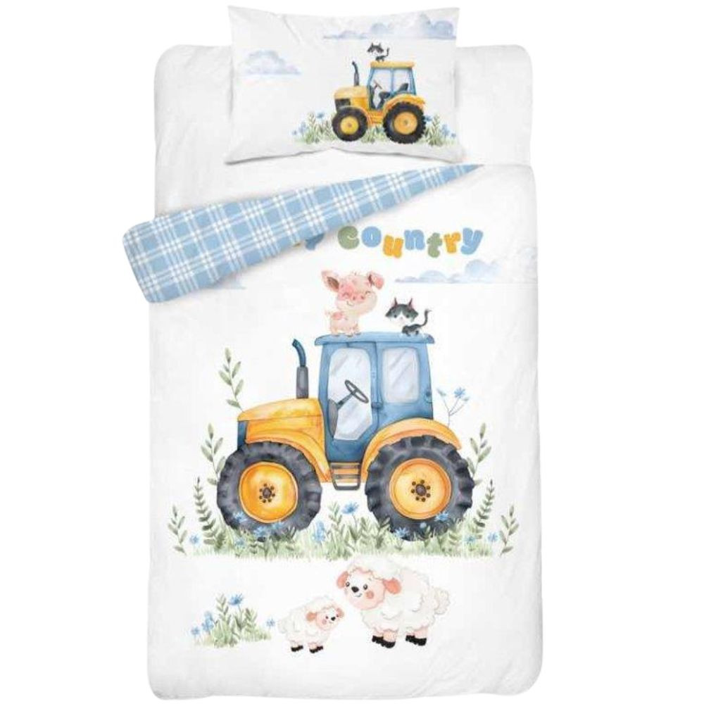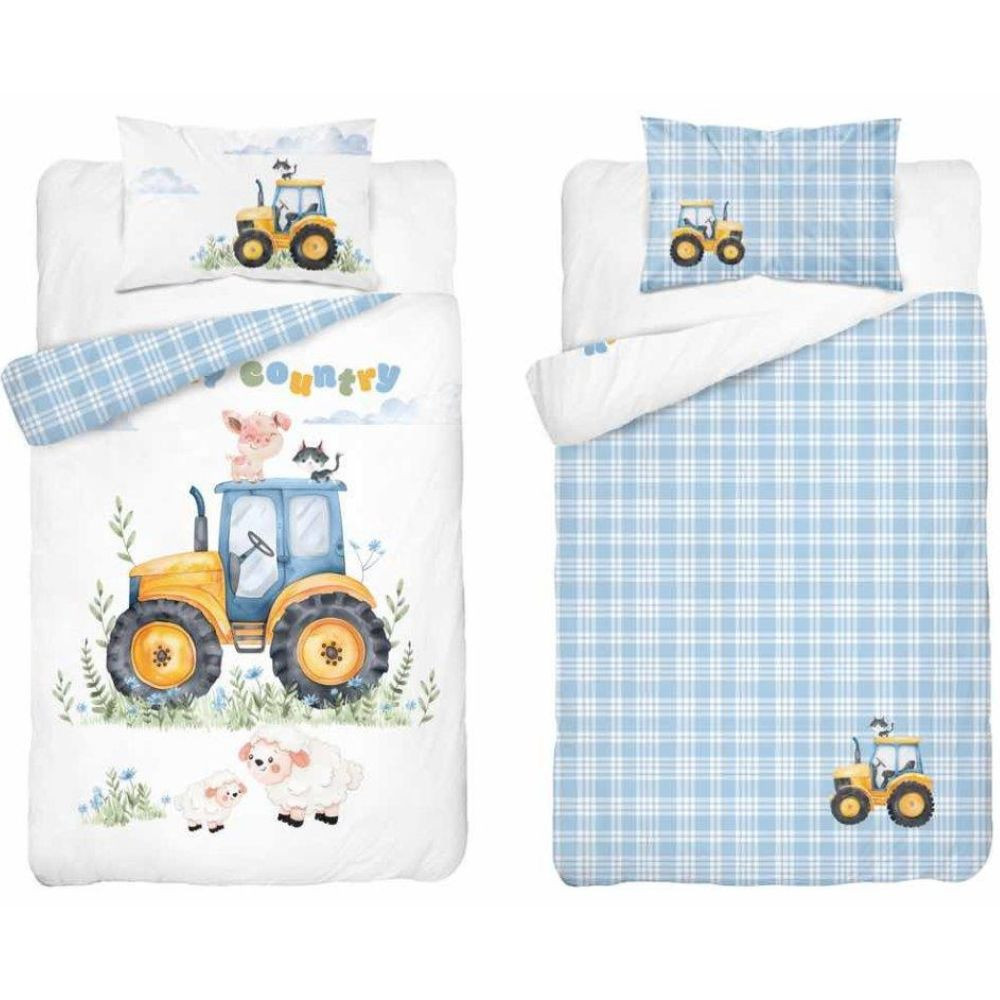 Nagyon aranyos traktoros 2 részes gyermek ágyneműhuzat garnitúra, ami kiváló minőségű 100% pamut anyagának köszönhetően kiváló választás kisgyermekek részére. Szín és formatartó.