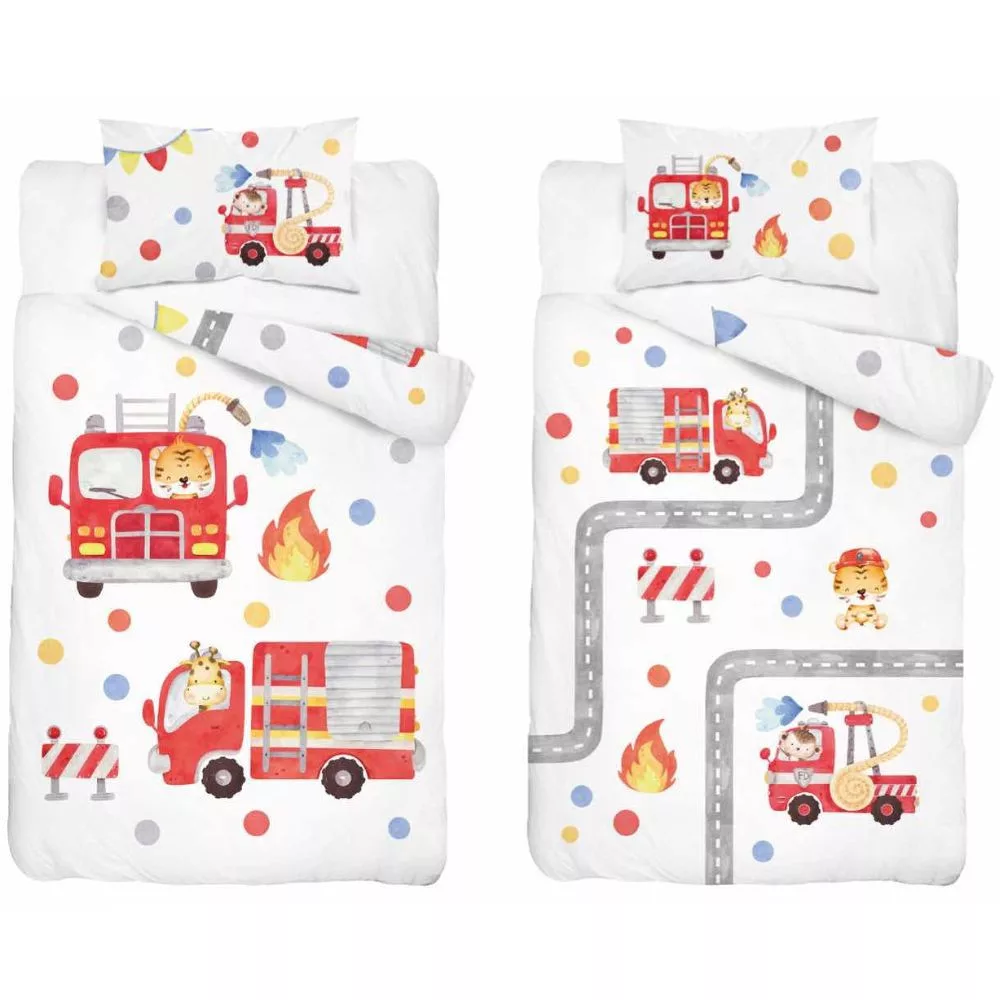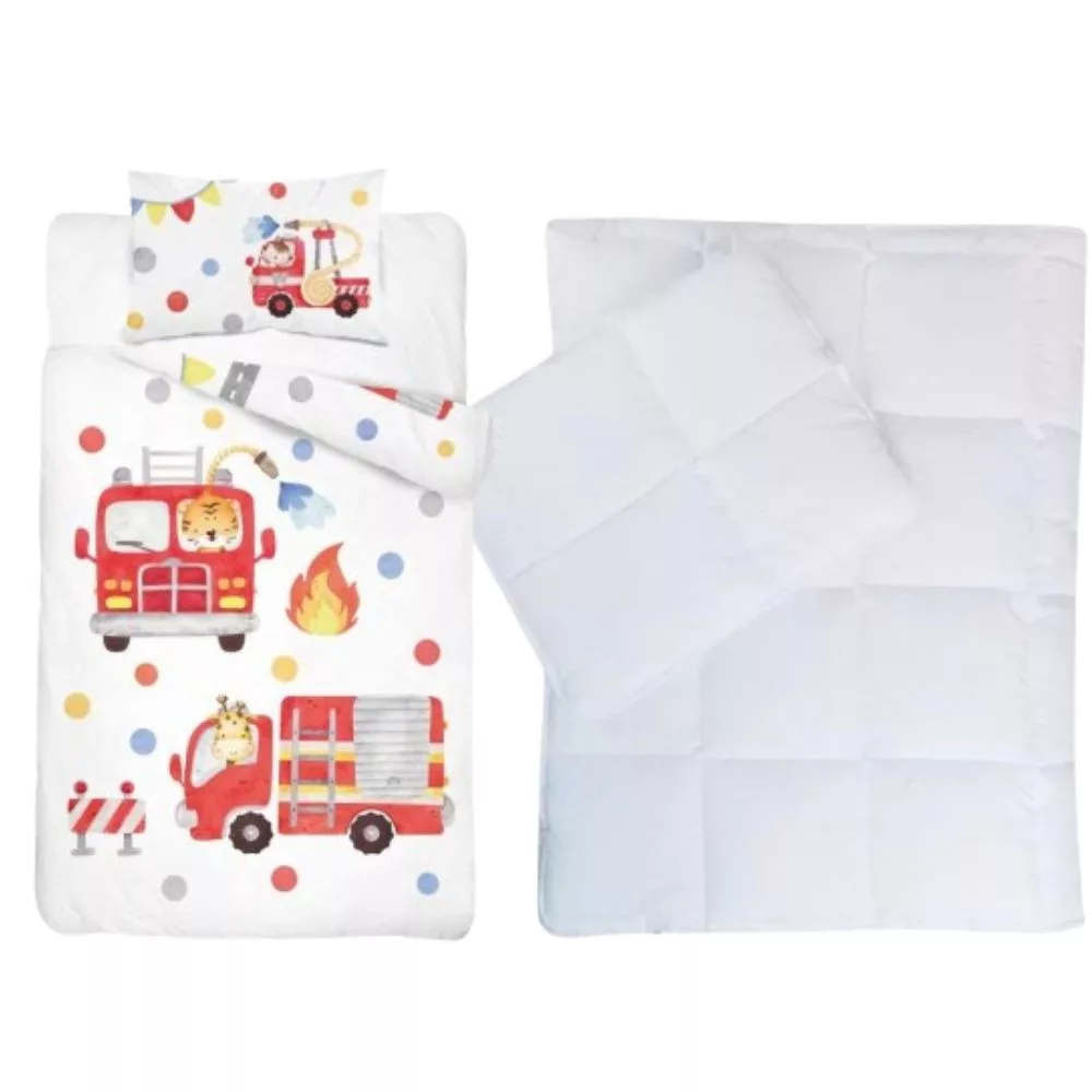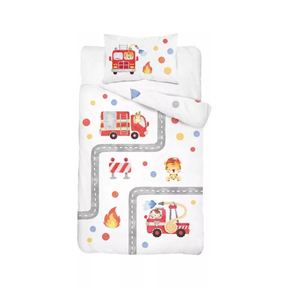 Nagyon aranyos motívumokkal ellátott 2 részes tűzoltós gyermek ágyneműhuzat garnitúra, a hozzá méretben azonos Lalian paplan-párna szettel együtt.