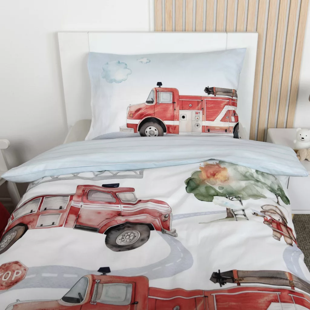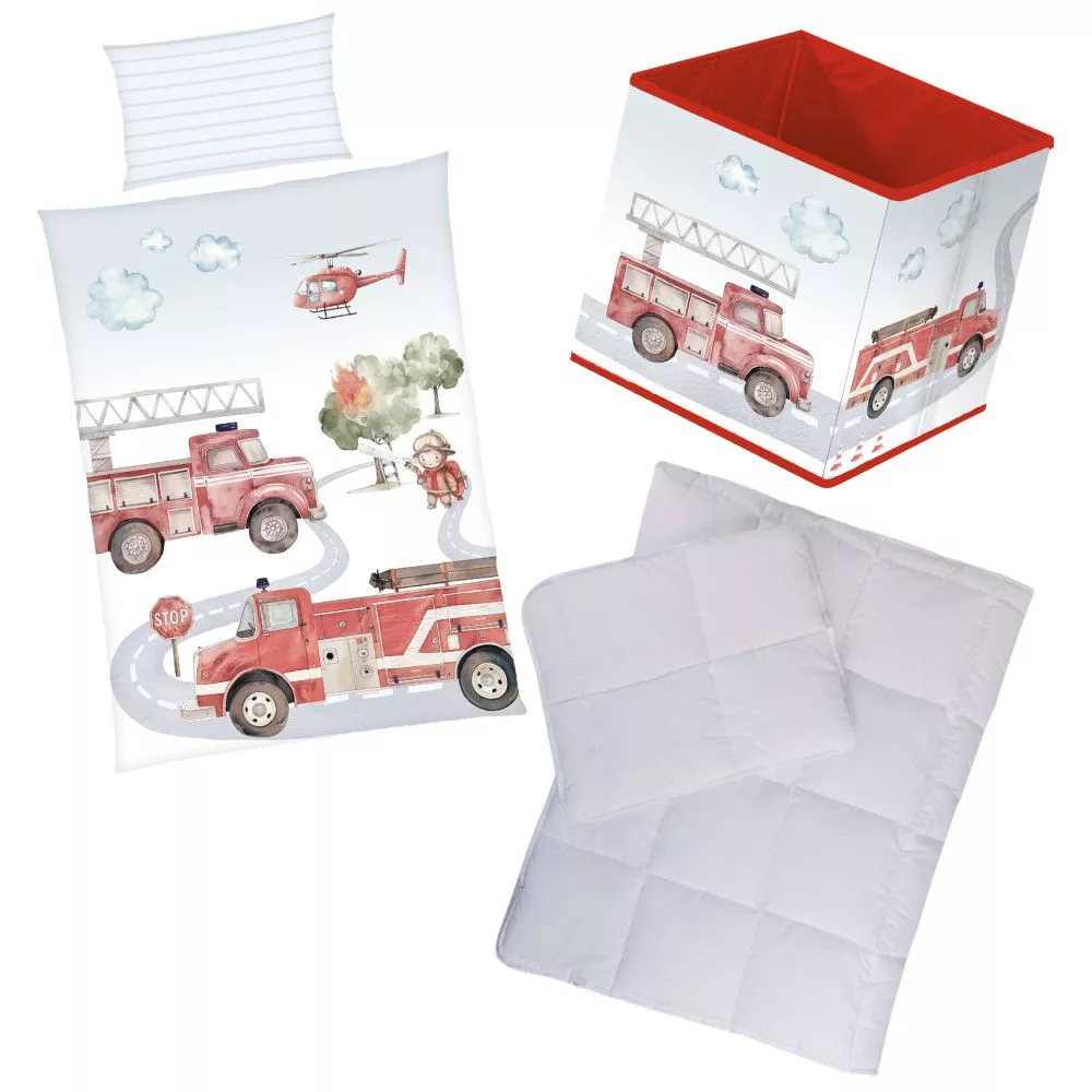 Tűzoltós mintás ovis ágyneműszett paplannal, párnával és 30×30×30 cm-es tárolódobozzal – tökéletes választás ovisoknak
